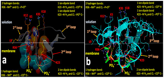 Figure 7, Figure 8, Figure 9 and Figure 10 show the binding sites with the highest binding affinity energies on surfaces of CTII and CTI for CL and PC. In brief, Autodock diagrams, in which atoms of interacting residues and polar heads are represented in a ball and stick fashion, allow a better overall 3D visualization of the intermolecular interactions, while Pymol diagrams, which utilize a stick representation for covalent bonds, facilitate the visualization of more details in the intermolecular interactions. Autodock data shown in Figure 7 and Figure 8 suggest a horizontal orientation of CTII with respect to the phospholipid membrane surface when interacting with PC + CL which is consistent with molecular dynamics (MD) simulations (Figure 5A,(Ba)). A key residue that enables the binding of CTII to CL is R36, which also agrees with the MD simulations (Figure 5(Ba)). Furthermore, Autodock data in Figure 7 and Figure 8 show the residue L9 in the binding CTII, which is involved in the initial binding to OMM according to the MD simulations (Figure 5(Ba)). However, our AutoDock docking did not identify any hydrogen bonds formed by L9 that could facilitate short-distance interactions with CTII. In addition, Autodock data suggest that residues K5, K12, K18 and K35 in CTII are solvent-exposed to mediate long-range electrostatic interactions with anionic polar heads [19] of neighboring membranes.