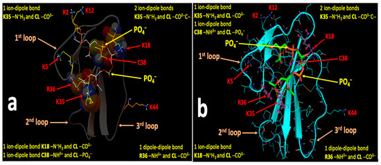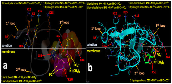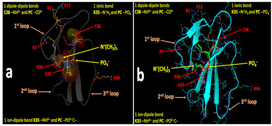 Autodock (a) and Pymol (b) diagrams showing the interaction of CTII with the polar head group of PC as shown in balls-cartoon-lines (CTII) and cartoon-sticks (PC) representations. CTII binds to the phospholipid membrane surface in a horizontal orientation by using three loop tips of CTII facing the viewer. Carbon atoms of PC are presented in the Autodock diagram as pink balls and in the Pymol diagram as green sticks. Atoms of amino acid residues interacting with PC are shown as balls and lines (Autodock) or pink squares (Pymol). The ball and stick diagram of K50 is not shown (only lines are given) as it covers the diagram of PC. Intermolecular bonds in the Pymol diagram are shown as yellow broken lines. Types of bonds are described in yellow label sentences both in the Autodock and Pymol diagrams. Amino acid residues K5, K12, K18 and K35, which presumably bind phospholipids of a neighboring phospholipid membrane, are depicted as lines in both the Autodoc and Pymol diagrams.