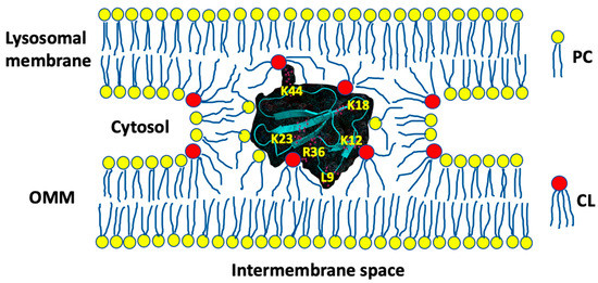 Intermembrane junction with a cardiotoxin in its center. Cardiotoxin CTII is given in a cartoon and dots representation. Amino acid residues R36 and L9 are predicted by our MD data as the key residues in the initial binding of CTII to the OMM. R36 binds to CL of the OMM while L9 penetrates to the hydrophobic region of the outer leaflet of the OMM. K5, K12, K18, K35, (not shown in this figure as they are on another side of CTII) and K44 presumably attract anionic phospholipids of neighboring lysosomes. K12 is also predicted by our AutoDock data along with K18, K23 and some other residues, which are not shown in this figure, to establish short-range intermolecular bonds with polar groups of CL and PC to support the further embedding of CTII into the OMM.