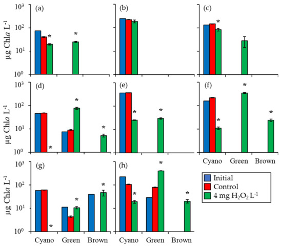 In summary, during the eight incubation experiments among four locations assessed fluorometrically, cyanobacterial levels were significantly lowered following the addition of H2O2 than the control in seven experiments, green algae levels became significantly higher in H2O2 treatments relative to the control in six of eight experiments, and unicellular brown algae became significantly higher in H2O2 treatments relative to the control in four of eight experiments.