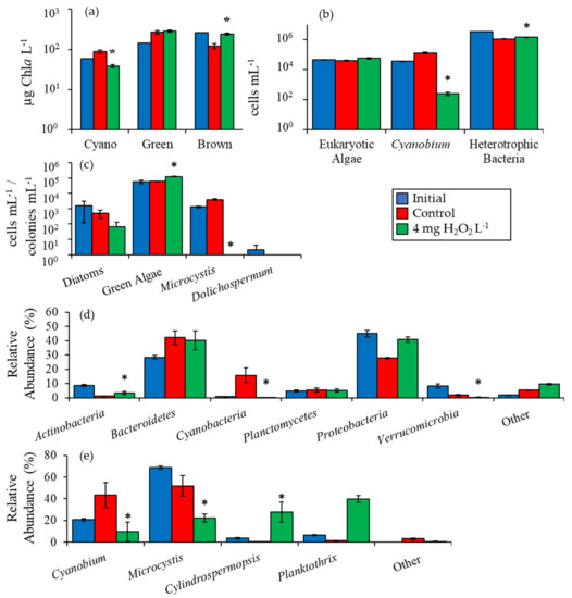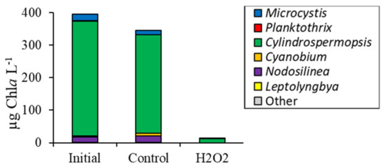 For the Roth Pond experiment, initial cyanobacterial biomass was 222 µg Chla L−1 and was dominated by Microcystis and Cylindrospermopsis (Figure 1h). Cyanobacterial biomass was 82% lower than the control (p < 0.001) at 19 ± 3 µg Chla L−1 in the 4 mg H2O2 L−1 treatment after six days. Initial green algae biomass was 29 µg Chla L−1 but rose in the H2O2 treatment to 403 ± 10 µg Chla L−1, 400% higher than the control (p < 0.001; Figure 1h). Unicellular brown algae were undetectable at the start of the experiment but were significantly higher than the control at 20 ± 3 µg Chla L−1 6 days after H2O2 exposure (p < 0.005; Figure 1h).