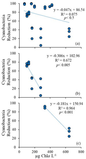 Regression plots for percent cyanobacterial reduction per initial unit biomass (µg Chla L−1) following the addition of 4 mg L−1 H2O2 for all experiments (a), Lake Agawam experiments (b), and Roth Pond experiments (c).