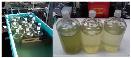 Outdoor flow-through table, and 4 L bottles used for incubation experiments. Example of pigment change between control and H2O2 treatments.