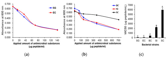 Antibacterial activity of the cell-free supernatant from L. taiwanensis. Antimicrobial activities of the cell-free supernatant from L. taiwanensis were examined against two Gram-negative bacteria (a) and two Gram-positive bacteria and a yeast (b), whose MIC50s were determined (c). x- and y-axes indicate the concentration of peptides in the used cell-free supernatant and the absorbances at 600 nm, respectively (a,b). The y-axis and different letters (A, B, and C) in (c) represent the MIC50 and significant differences (p < 0.05), respectively. SG; Salmonella Gallinarum, EC; enteropathogenic E. coli, BC; Bacillus cereus, SI; Streptococcus iniae, SC; Saccharomyces cerevisiae.