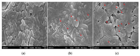 Scanning electron micrographs of S. Gallinarum treated with the cell-free supernatants from L. taiwanensis. S. Gallinarum was treated without (a) or with the cell-free supernatant (77.1 μg peptides/mL, MIC50 against S. Gallinarum) from L. taiwanensis for 6 h (b) and 24 h (c). The red arrows indicate the pores forming in the Salmonella membrane.