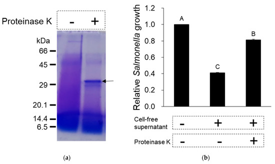 Effect of protease on the antimicrobial activity of the cell-free supernatant from L. taiwanensis. Proteinase K (100 µg/mL) was added to the cell-free supernatant (77.1 μg peptides/mL, MIC50 against S. Gallinarum) from L. taiwanensis. The 15% SDS-PAGE was performed to identify the degradation of proteins and peptides (a), and the proteinase K-treated sample was used to examine the antimicrobial activity against S. Gallinarum (b). The arrow in (a) represents degraded proteins or peptides. The y-axis and different letters (A, B and C) in the graphs represent the relative growth of S. Gallinarum and significant differences (p < 0.05), respectively.