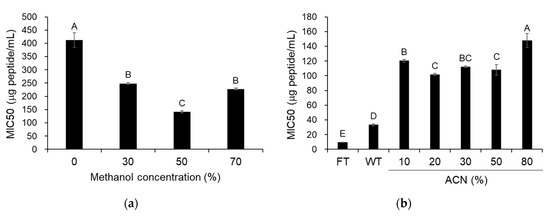 In addition, typical AMPs have common features, such as cationicity and amphipathicity [9,10], and are known to exhibit optimum antimicrobial activity with 50% hydrophobicity [24]. For example, the precipitate, obtained after the centrifugation of methanol extractions with a very high hydrophobicity, was reported to exhibit very little antimicrobial activity [24]. In this study, the supernatants obtained after the centrifugation of methanol extracts from the L. taiwanensis cell-free supernatant showed significant antimicrobial activities against S. Gallinarum, and in particular, the supernatant from the 50% methanol extraction exhibited higher antimicrobial activity than the other supernatant (Figure 5a), which supports the fact that the cell-free supernatant from L. taiwanensis includes AMPs, with features like cationicity and amphipathicity. Furthermore, when the supernatant from the 50% methanol extraction was subjected to purification using Sep-Pak columns, the fractions eluted using 10% to 80% ACN exhibited various antimicrobial activities against S. Gallinarum (Figure 5b), suggesting that the cell-free supernatant from L. taiwanensis may include various amphipathic peptides, with both hydrophilic and hydrophobic tendencies, responsible for the antimicrobial activity.