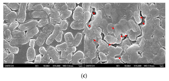 S. Gallinarum was incubated with the cell-free supernatant from L. taiwanensis culture for 0, 6, and 24 h. The treated S. Gallinarum cells were fixed with one volume of 2.5% glutaraldehyde (Sigma-Aldrich, St. Louis, MO, USA) for 24 h at 4 °C. Then, the samples were rinsed with sterile PBS buffer thrice and sequentially dehydrated with graded ethanol (30%, 50%, 70%, 80%, 90%, and 100% (v/v); 15 min incubation for each concentration). Finally, the samples were dried at room temperature and sputter-coated with gold for SEM.