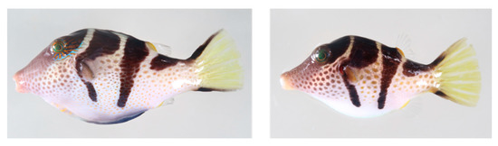 In April 2019, 10 specimens of C. valentini (Table 1) were collected at a coral reef off of Amami-Oshima Island in the Kagoshima Prefecture of Japan. They were transported live to the Shimonoseki Marine Science Museum, and after distinguishing males and females on the basis of the male-specific appearance, i.e., blue-green and orange lines that radiate posteriorly from both eyes, and a blue-gray patch anterior to the anus (Figure 1) [25], the muscle, liver, intestine, gallbladder, gonads, and skin were dissected out. The tissues were placed in individual plastic bags, frozen, and transported to the laboratory of Nagasaki University. They were stored below −30 °C until toxin quantification.