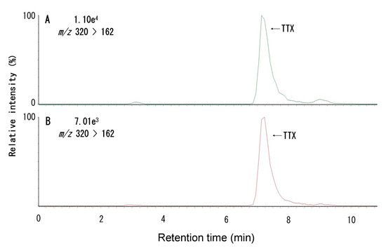 Pufferfish of the family Tetraodontidae are generally toxic, but the toxin profile differs, depending on the genus or species. Marine pufferfish of the genus Takifugu inhabiting the coastal waters of Japan possess the potent neurotoxin tetrodotoxin (TTX) as the major toxic component [1]. The liver and ovary, and, in some species, the skin, are strongly toxic [1,2] and the ingestion of these tissues often causes food poisoning. The muscle and testis, however, are nontoxic or weakly toxic and their consumption is thus permitted in Japan [3,4]. Although the regulatory limits for TTX consumption are not clearly defined in Japan, 10 mouse units (MU)/g tissue (equivalent to 2.2 µg TTX/g or 6.9 nmol TTX/g) is generally used as the criterion for deciding whether or not the pufferfish tissue is edible; the European Food Safety Authority, however, claims that a concentration below 44 µg TTX equivalents/kg shellfish meat, which is much lower than the Japanese criterion, does not result in adverse effects in humans [5]. TTX is an exogenous toxin for pufferfish, which ingest TTX-bearing benthic food organisms such as starfish, marine snails, and flatworms, and accumulate the toxin in specific organs [1]. The intra-body distribution of the toxins may change, depending on the growth and maturity of the individual [6,7,8,9].