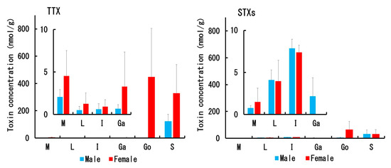 Concentration of TTX (left) and STXs (neoSTX + dcSTX + STX; right) in each tissue of male and female C. valentini specimens. Data are shown as the mean (columns) and SD (error bars). M = muscle, L = liver, I = intestine, Ga = gallbladder, Go = gonads, and S = skin.
