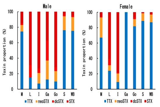 The proportion of toxin components in each tissue of male and female C. valentini specimens is shown in Figure 6. The ratio of TTX and STXs (neoSTX + dcSTX + STX) in both males and females differed greatly, depending on the tissue. In males, TTX accounted for ~75% of the total toxin amount in the muscle and skin, while STXs accounted for ~90% in the other tissues. In females, as in males, TTX was the major component in the muscle and skin, and STXs were the major component in the liver and intestine. In strong contrast to males, TTX was the major component in the gallbladder and gonads in females. The STX composition also differed, depending on the tissue; in the skin and ovary, which accounted for most of the total toxin amount, neoSTX was the main component, and dcSTX and STX comprised the minor components, whereas in the other tissues, except for the female muscle, STX was the main component, and neoSTX and dcSTX were the minor components. In the whole body, the main toxin component of C. valentini was TTX in both males and females, but STXs, mainly neoSTX, comprised 25% of the toxin in males and 13% in females.