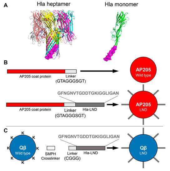 Schematic of virus-like particles (VLPs) Displaying α-hemolysin (Hla) linear neutralizing domain (LND). (A) (Left) Ribbon depiction of Hla heptameric pore based on 3ANZ.pdb. Monomers are shown in different colors and LND region shown as purple spheres. (Right) Ribbon depiction of Hla monomer with LND region shown as described above. Figures produced using PyMOL (The PyMOL Molecular Graphics System, Version 2.0 Schrödinger, LLC.) (B) (Top left) Linear schematic depicting wild type AP205 coat protein with C-terminal linker; (top right) schematic of assembled AP205 wild type VLP; (Bottom left) linear schematic of AP205 coat protein with Hla-LND sequence genetically inserted; (bottom right) schematic of assembled AP205-LND VLP created through molecular cloning. (C) (Left) schematic of assembled Qβ wild type VLP depicting surface exposed lysines; (center) linear depiction of SMPH crosslinker and synthetic CGGG-Hla-LND prior to chemical conjugation to surface lysines; (right) schematic of assembled Qβ VLP displaying surface lysine conjugated LND peptides.