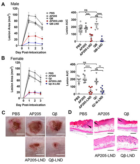 To assess the efficacy of our VLP-LND vaccines, we used a well-established mouse model of S. aureus skin infection/intoxication, where formation of a necrotic lesion is Hla-dependent [10,19,20,21]. In this model, the necrotic lesion visibly forms on the skin surface and lesion size is easily measurable [22,23,24,25,26], allowing straightforward assessment of Hla vaccine efficacy. Mice were immunized with two doses of AP205-LND or Qβ-LND VLPs. As controls, mice were immunized with similar doses of wild type, unmodified VLPs or were mock vaccinated with PBS. Eight weeks post-boost, mice were challenged by subcutaneous injection of rHla. The ability of vaccination to protect mice was evaluated by measuring lesion area for three days after Hla injection and by the calculated area under the curve (AUC) for the three-day challenge. Male and female mice were analyzed separately because female mice are more resistant to Hla compared to males [23], and different concentrations of Hla were subcutaneously injected in effort to achieve similar size lesions between the sexes. Hla-induced lesion size was significantly reduced in both AP205-LND and Qβ-LND vaccinated male (~60% and 94%, respectively) and female mice (~79% and 73%, respectively) compared to control mice (Figure 2A–C). The two VLP-based vaccines provided statistically similar protection from lesion formation in both sexes.