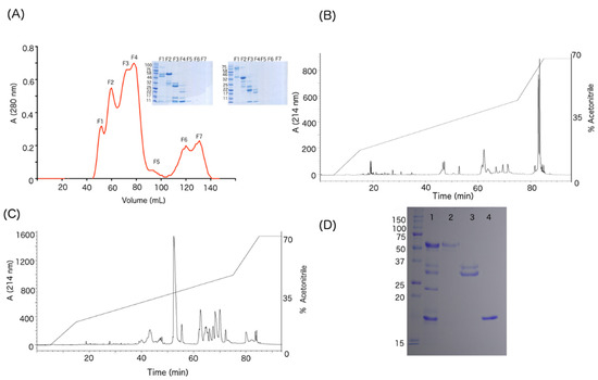 The WV was separated by size-exclusion chromatography (Figure 2A), yielding seven fractions. Subsequent SDS-PAGE showed protein bands for the first four fractions only. As shown in the inset of Figure 2A, FI has high molecular weight bands of approximately 50 and 110 kDa and FII has a predominant band of 55 kDa and other bands close to 32 kDa. FIII has an abundant band at 28 kDa and others around 14 and 10 kDa, while FIV shows three main bands of 22, 14 and 10 kDa.