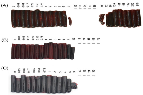 Group 2 (injected with the WV IM., blood but not lymph collected) coagulation tests. Clots come from blood samples collected at different times (shown in h), where time zero refers to the blood sample collected before administration of venom. At times where no clot is depicted this is because the clot failed to form, and the blood was completely liquid. (A) Sheep 2A; (B) Sheep 2B; (C) Sheep 2C.