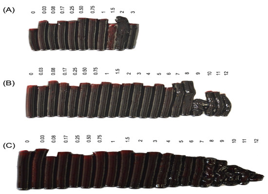 Blood samples were collected at defined intervals from three groups of sheep (Figure 1 and Table 2). Animals in G2, which received venom injected IM, developed severe coagulation abnormalities. This is graphically illustrated in Figure 3, in which the clots produced at each time point have been removed from the red cap tubes and laid out in sequence. Sheep 2A developed clotting abnormalities 9 h after administration of venom, with complete absence of clotting between 12 and 36 h and recovery between 48 and 120 h. For the sheep 2B coagulopathy began at 12 h with a decrease in clot size, whereas no clotting was observed in samples from 18 to 72 h. Finally, for sheep 2C the coagulation alterations began at 9 h when a very small clot was observed, and from 12 h to death at 36 h no clot was formed (Figure 3). In Group 3, animal 3A did not develop coagulation alterations during the 3 h before death, whereas sheep 3B and 3C began to show abnormal clots at 9 and 8 h, respectively. These clots diminished in size and thickness until the conclusion of the experiment at 12 h, as illustrated in Figure 4B,C.