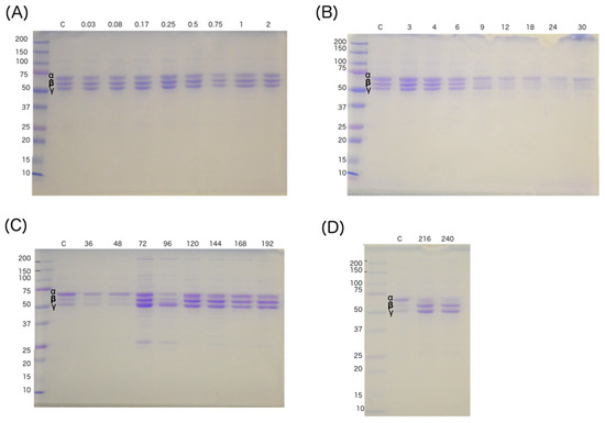 Representative fibrinogen analysis, showing results from G2 (sheep 2A). SDS-PAGE at 12.5% in the presence of 2-mercaptoethanol. The numbers above each gel indicate the time the samples were collected. (A) samples collected from 0.03 to 2 h; (B) samples collected from 3 to 30 h; (C) samples collected from 36 to 192 h; (D) samples collected at 216 and 240 h. At 12 h degradation of the fibrinogen chain α and β is observed, and at 72 h recovery is observed. Amount of fibrinogen analyzed at 9, 12, 18, 24, 30, 36 and 48 h, was 2.9, 1.2, 2.0, 1.6, 1.3, 2.0 and 3 µg, respectively. For the rest of the samples, 5 µg were analyzed. C: fibrinogen control. Some in vitro degradation is apparent in the lower two gels, attributable to a 3-h difference in timing of the assay.