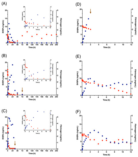Concentrations of Snake Venom Serine Proteases (SVSPs) (blue) and fibrinogen (red) in blood. A, B and C show the values obtained for the three animals of G2 and D, E, and F show the values of G3. Inset graphs for G2 animals illustrate only the first 12 h, to facilitate comparison with G3. The arrow shows the time of death.