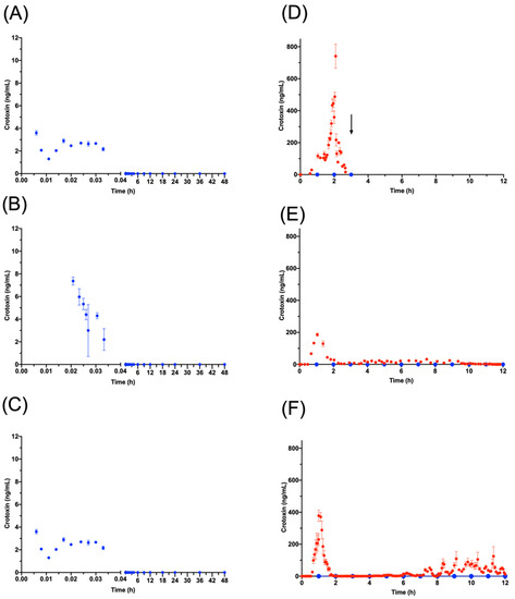 Crotoxin concentrations. In the three G1 sheep (A–C), crotoxin was quantifiable for only 2 min in blood (blue) before becoming undetectable. (D–F) show crotoxin concentrations in G3 sheep (G3A (D); G3B (E); G3C (F). In lymph (red), crotoxin could be quantified from 0.5 h to 12 h, the duration of the experiment. In the blood samples from the same animals (blue) crotoxin was undetectable throughout the experiment. The arrow in D indicates the time of death of the animal.