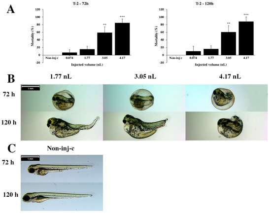 Effects of T-2 mycotoxin injected in different volumes on 72 and 120 hpf zebrafish embryos. Mortality results of T-2 were checked following 72 and 120 h of injection (A). Lethality data are expressed as mean ± SD from three independent experiments in triplicate. Kruskal–Wallis followed by Dunn’s post hoc test was used. Mortality values of injected volume were compared to results of noninjected control (** p < 0.01, *** p < 0.001). T-2 induced representative development dysfunctions in zebrafish embryos following injection were examined after 72 and 120 h of injection (B). Typically, hook-like tail, pericardial edema, yolk edema, eye lens, head distortion and lack of hatching were observed. Phenotypes of treated groups were compared to noninjected control (Non-inj-c) groups (C). Scale bar: 1 mm. Quantitative data of developmental dysfunctions in zebrafish embryos are in supplementary materials Tables S1 and S2).