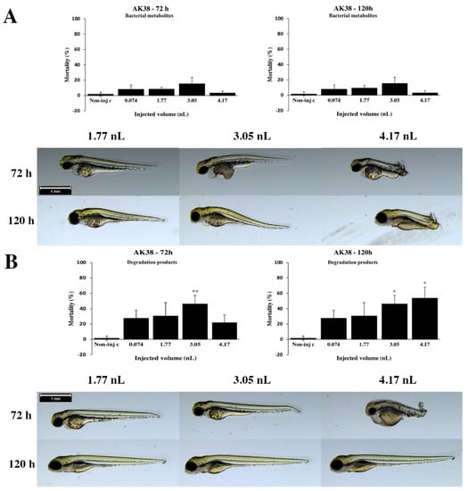 Effects of the Rhodococcus gordoniae AK38 strain bacterial (A) and degradation (B) metabolites injected in different volumes on 72 and 120 hpf zebrafish embryos. Mortality results of the AK38 strain bacterial (A, above) and degradation (B, above) metabolites were checked following 72 and 120 h of injection. Lethality data are expressed as mean ± SD from three independent experiments in triplicate. Kruskal–Wallis followed by Dunn’s post hoc test was used. Mortality values of injected volume were compared to results of noninjected control (* p < 0.05, ** p < 0.01). The AK38 strain bacterial (A, bottom) and degradation (B, bottom) metabolites induced representative development dysfunctions in zebrafish embryos following injection were examined after 72 and 120 h of injection. Typically, tail deformities, pericardial and yolk edema were detected. Scale bar: 1 mm. Phenotypes of treated groups were compared to noninjected control (Non-inj-c) groups (Figure 1C). Quantitative data of developmental dysfunctions in zebrafish embryos are in supplementary materials Tables S1 and S2).