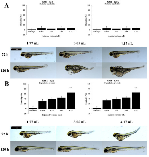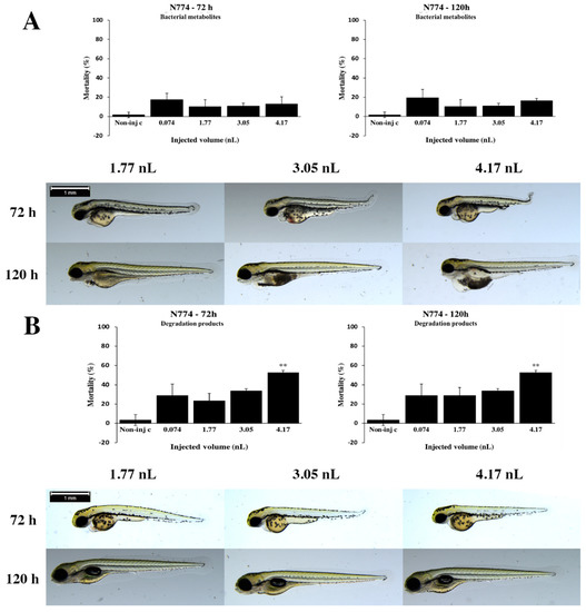 Effects of the Rhodococcus ruber N361 strain bacterial (A) and degradation (B) metabolites injected in different volumes on 72 and 120 hpf zebrafish embryos. Mortality results of the N361 strain bacterial (A, above) and degradation (B, above) metabolites were checked following 72 and 120 h of injection. Lethality data are expressed as mean ± SD from three independent experiments in triplicate. Kruskal–Wallis followed by Dunn’s post hoc test was used. Mortality values of injected volume were compared to the results of noninjected control (** p < 0.01). The N361 strain bacterial (A, bottom) and degradation (B, bottom) metabolites induced representative development dysfunctions in zebrafish embryos following injection were examined after 72 and 120 h of injection. Typically, tail deformities, pericardial and yolk edema and head distortion were detected. Scale bar: 1 mm. Phenotypes of treated groups were compared to noninjected control (Non-inj-c) groups (Figure 1C). Quantitative data of developmental dysfunctions in zebrafish embryos are in supplementary materials Tables S1 and S2).