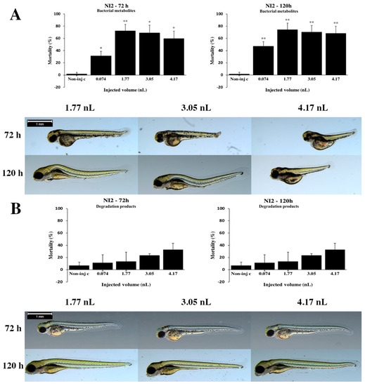 Effects of the Rhodococcus rhodochrous NI2 strain bacterial (A) and degradation (B) metabolites injected in different volumes on 72 and 120 hpf zebrafish embryos. Mortality results of the NI2 strain bacterial (A, above) and degradation (B, above) metabolites were checked following 72 and 120 h of injection. Lethality data are expressed as mean ± SD from three independent experiments in triplicate. Kruskal–Wallis followed by Dunn’s post hoc test was used. Mortality values of injected volume were compared to results of noninjected control (* p < 0.05, ** p < 0.01). The NI2 strain bacterial (A, bottom) and degradation (B, bottom) metabolites induced representative development dysfunctions in zebrafish embryos following injection were examined after 72 and 120 h of injection. Representative phenotypic lesions were tail deformities, pericardial edema, head and lens distortion and yolk edema. Scale bar: 1 mm. Phenotypes of treated groups were compared to noninjected control (Non-inj-c) groups (Figure 1C). Quantitative data of developmental dysfunctions in zebrafish embryos are in supplementary materials Tables S1 and S2).
