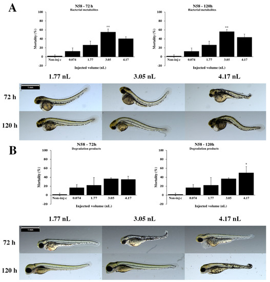 Effects of the Rhodococcus globerulus N58 strain bacterial (A) and degradation (B) metabolites injected in different volumes on 72 and 120 hpf zebrafish embryos. Mortality results of the N58 strain bacterial (A, above) and degradation (B, above) metabolites were checked following 72 and 120 h of injection. Lethality data are expressed as mean ± SD from three independent experiments in triplicate. Kruskal–Wallis followed by Dunn’s post hoc test was used. Mortality values of injected volume were compared to the results of noninjected control (** p < 0.01). The N58 strain bacterial (A, bottom) and degradation (B, bottom) metabolites induced representative development dysfunctions in zebrafish embryos following injection were examined after 72 and 120 h of injection. Typically, yolk edema, tail deformities, pericardial edema and head and lens distortion were detected. Scale bar: 1 mm. Phenotypes of treated groups were compared to noninjected control (Non-inj-c) groups (Figure 1C). Quantitative data of developmental dysfunctions in zebrafish embryos are in supplementary materials Tables S1 and S2).