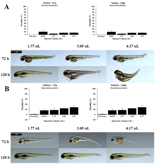 Effects of the Gordonia paraffinivorans NZS14 strain bacterial (A) and degradation (B) metabolites injected in different volumes on 72 and 120 hpf zebrafish embryos. Mortality results of the NZS14 strain bacterial (A, above) and degradation (B, above) metabolites were checked following 72 and 120 h of injection. Lethality data are expressed as mean ± SD from three independent experiments in triplicate. Kruskal–Wallis followed by Dunn’s post hoc test was used. Mortality values of injected volume were compared to results of noninjected control (* p < 0.05). The NZS14 strain bacterial (A, bottom) and degradation (B, bottom) metabolites induced representative development dysfunctions in zebrafish embryos following injection were examined after 72 and 120 h of injection. Typically, yolk edema, tail deformities, pericardial edema and head and lens distortion were detected. Scale bar: 1 mm. Phenotypes of treated groups were compared to noninjected control (Non-inj-c) groups (Figure 1C). Quantitative data of developmental dysfunctions in zebrafish embryos are in supplementary materials Tables S1 and S2).