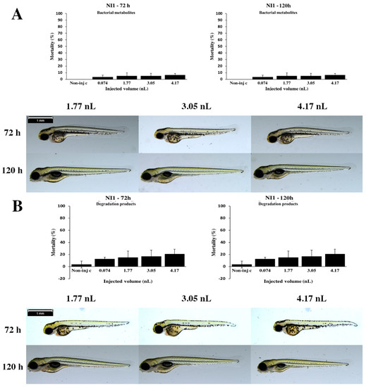 Effects of the Rhodococcus erythropolis NI1 strain bacterial (A) and degradation (B) metabolites injected in different volumes on 72 and 120 hpf zebrafish embryos. Mortality results of the NI1 strain bacterial (A, above) and degradation (B, above) metabolites were checked following 72 and 120 h of injection. Lethality data are expressed as mean ± SD from three independent experiments in triplicate. Kruskal–Wallis followed by Dunn’s post hoc test was used. Mortality values of injected volume were compared to the results of noninjected control. The NI1 strain bacterial (A, bottom) and degradation (B, bottom) metabolites induced representative development dysfunctions in zebrafish embryos following injection were examined after 72 and 120 h of injection. Typically, yolk edema, tail deformities and pericardial edema were detected. Scale bar: 1 mm. Phenotypes of treated groups were compared to noninjected control (Non-inj-c) groups (Figure 1C). Quantitative data of developmental dysfunctions in zebrafish embryos are in supplementary materials Tables S1 and S2).