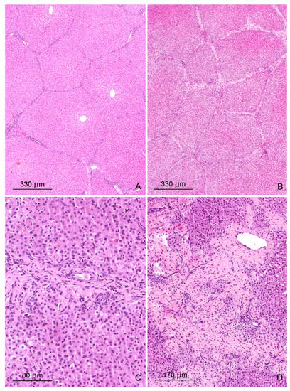 The foci of hepatocyte necrosis with lymphocytic infiltrates, portal, periportal, and acinar inflammation occur in the liver as a result of drug usage, intoxication, or viral and bacterial infections [39]. The occurrence of necrosis is also associated with the activation of immune mechanisms in response to the adverse effects of toxic substances [36,40]. These changes are generally associated with pathological symptoms; however, they also occur in seemingly healthy animals, and, in this case, they are considered as preclinical conditions [41].
