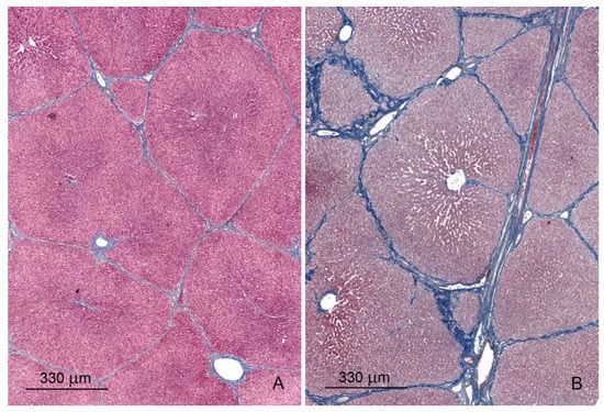 We evaluated the architectural changes in the liver, noting the organization of hepatic cords, the appearance of perilobular connective tissue, and the penetration of collagen into the parenchyma on Mallory- and HE-stained specimens.