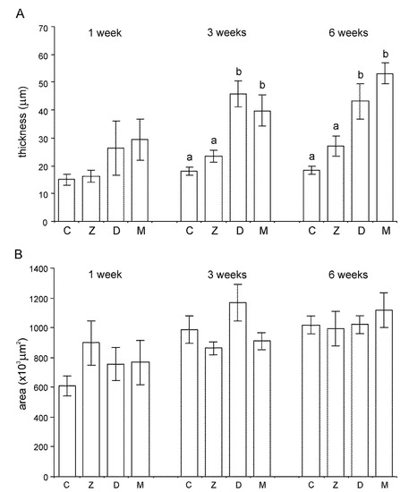 (A) Thickness of the connective tissue septa. (B) Cross-sectional area of the liver lobules. C—control group, Z—group treated with zearalenone (ZEN), D—group treated with deoxynivalenol (DON), and M—group treated with DON and ZEN. The values are presented as mean ± standard deviation. Bars labeled with different small lower-case letters differ significantly at p ≤ 0.05.