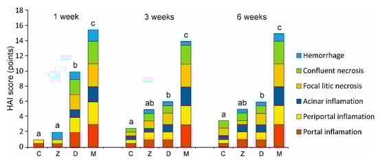 Histopathological score of the examined livers according to the histology activity index (HAI) modified by Stanek et al. [38]. Six histopathological parameters were scored in hematoxylin and eosin (HE)-stained tissues (see Figure S1 in Supplementary material), and the cumulative HAI score was calculated for each experimental group. The mean value of the cumulative HAI scores in each group is represented by the total height of the bar. C—control group, Z—group treated with zearalenone (ZEN), D—group treated with deoxynivalenol (DON), and M—group treated with DON and ZEN. The values of the cumulative HAI score labeled with different lower-case letters above the bars differ significantly at p ≤ 0.05.