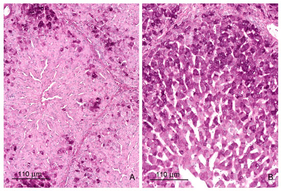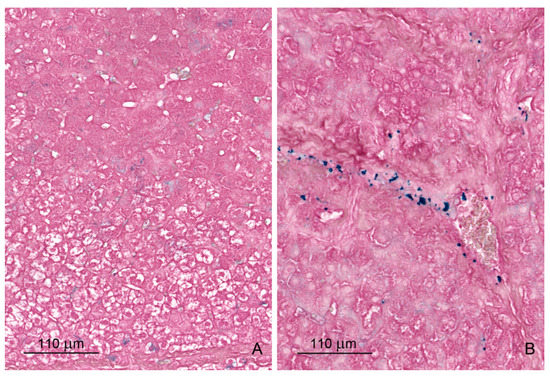 Physiologically, iron deposits are present within hepatocytes as fine granules at the biliary pole of cells and are distributed throughout the lobule according to a decreasing gradient from periportal to centrilobular areas. Iron excess is associated with chronic liver diseases of various causes [46,47,48]. It is known that in states of persistent iron overload, the liver could be seriously affected [49], mainly because of the extremely reactive hydroxyl radical formed during Fe2+ metabolism (by Fenton reaction) in lysosomes [50].