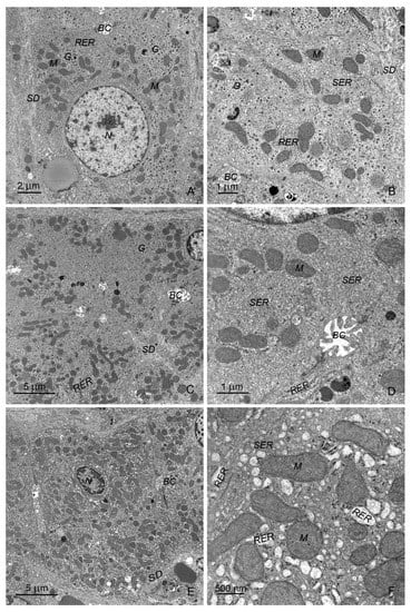 (A–F) Ultrastructure of hepatocytes in control pigs, 6th week of the experiment (A,B), pigs treated with ZEN for 6 weeks (C,D) and pigs treated with DON for 6 weeks (E,F). Note the specific organization of endoplasmic reticulum with the predominance of smooth reticulum over rough reticulum in pigs treated with ZEN. In DON-treated animals, both types of endoplasmic reticulum were formed by abundant short, dilated cisterns and vesicles. SD, space of Disse; BC, bile canaliculus; N, nucleus; M, mitochondria; RER, rough endoplasmic reticulum; SER, smooth endoplasmic reticulum; G, glycogen particles.