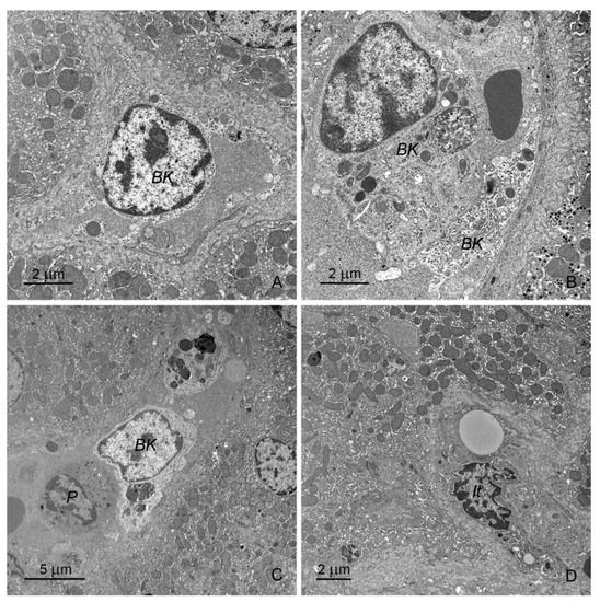 (A,B) Browicz–Kupffer cells (BK) in the sinusoid of pigs treated with DON for 3 weeks (A) and 6 weeks (B). Note the presence of numerous processes in Figure (A) and lysosomes and rest bodies in Figure (B,C). BK and pit (P) cells in the sinusoid of a pig treated with DON + ZEN for 6 weeks. (D) Ito cell (It) in the perivascular space of pigs treated with DON + ZEN for 6 weeks. Note the cisterns of the rough endoplasmic reticulum.