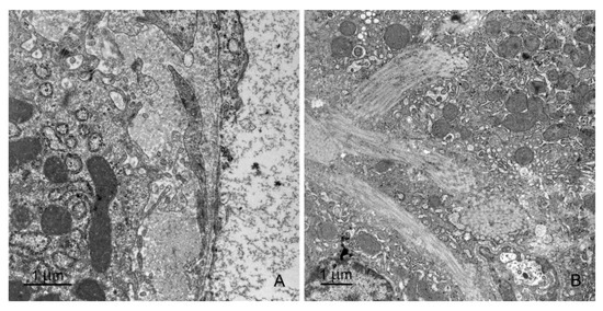 The differences in hepatocyte ultrastructure in experimental pigs compared with control animals were evident after 1, 3, and 6 weeks of treatment. The hepatocytes of ZEN-treated animals were characterized by a specific ER (Figure 7C,D). The smooth ER consisted of a network of closely located very narrow tubules and small vesicles, and occupied most of the cross sections of the hepatocytes. The poorly developed rough ER created several clusters of cisterns arranged in parallel. The mitochondria were located near these cisterns. Changes in the ER were observed from the first week of experiment; however, the intensity increased markedly after 3 and 6 weeks of treatment with ZEN. The ultrastructure of the mitochondria and lysosomes in ZEN-treated pigs did not differ significantly from that in the control animals. However, occasionally, some damaged mitochondria were observed. The amount of glycogen deposits in hepatocytes was usually low, except in the samples taken after the first week of the experiment. Some necrotic hepatocytes were noted, especially after 6 weeks of treatment.