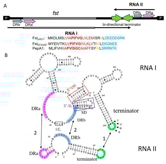 The parpAD1 locus of the Enterococcus faecalis pheromone-responsive conjugative plasmid pAD1 was the first type I toxin-antitoxin (TA-1) system identified and characterized in Gram-positive bacteria [1,2,3]. It consists of a ~230 nucleotide mRNA, designated RNA IpAD1 and encoding the 33 amino acid toxin of the system, FstpAD1, and the ~40 nucleotide sRNA antitoxin, RNA IIpAD1. The toxin and antitoxin RNAs are transcribed from convergent promoters and share a bidirectional factor-independent transcriptional terminator [3] (Figure 1A). The resultant complementary terminator stem-loops provide the site of initiation of complex formation between toxin and antitoxin RNAs with a U-turn motif in the toxin RNA playing a key role in forming the initial reversible kissing complex [4] (Figure 1B). In addition, the toxin and antitoxin RNAs are transcribed in opposite directions across a pair of DNA direct repeats, DRa and DRb, which provide a second region of complementarity between the RNAs. Interaction in this region suppresses translation of the toxin by sequestering the FstpAD1 translation initiation site [4,5,6]. An intramolecular stem-loop within RNA IpAD1, the 5′-SL in Figure 1B, sequesters the FstpAD1 Shine–Dalgarno (SD) sequence until interaction with RNA IIpAD1 can be completed [7]. Once irreversible interaction is established at all of the complementary regions, RNA IpAD1 and RNA IIpAD1 form a stable complex that facilitates the accumulation of a translationally inactive pool of the toxin message [8]. RNA IIpAD1 is preferentially degraded from the pool by an unknown mechanism, although an intramolecular “upstream helix” (5′-UH in Figure 1B) sequestering the extreme 5′ end of RNA IpAD1 contributes to its differential stability [5,9]. At steady state, the two RNAs are maintained at an approximately equimolar ratio and as long as the plasmid is maintained in the cell, the antitoxin is continually replenished by ongoing transcription [8]. If the plasmid is lost, RNA IIpAD1 is degraded from the complex pool, FstpAD1 is translated from RNA IpAD1, and host cell growth is inhibited [2,10]. Thus, the parpAD1 locus functions as a typical post-segregational killing (PSK) or addiction module [11]. The salient features of the parpAD1 locus and the important structural elements of RNA IpAD1 and RNA IIpAD1 are shown in Figure 1.