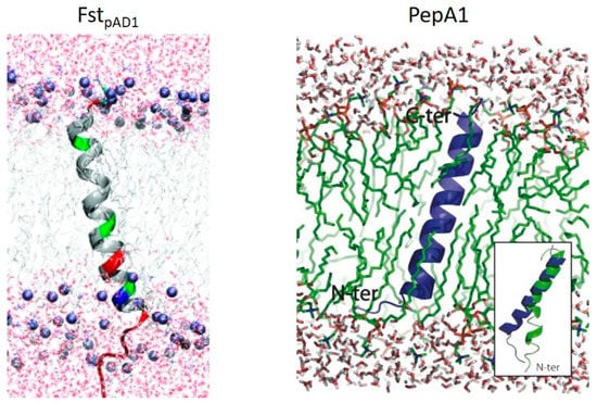 NMR-derived structure of two Fst-family proteins in membrane mimetics. FstpAD1 presents a linear helix postulated to have the N-terminus outside the cell (top) and the C-terminus inside the cell (bottom). Polar amino acids are shown in green, negatively charged residues in red and positively charged residues in blue. Reprinted with permission from [18]. PepA1 forms a similar linear helix spanning the membrane. Membrane interaction appears to straighten a kink produced at the cysteine residue in all staphylococcal Fst-family toxins (inset). Reprinted with permission from [19].