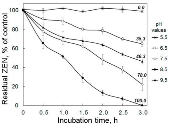The effect of pH on the dynamics of zearalenone (ZEN) degradation in model solutions by recombinant lactonohydrolase expressed in Penicillium canescens. The enzyme preparations tested (PR-ZHD) represented the freeze-dried supernatants of culture liquid (CL) of the transformed P. canescens PCA-10, which were dissolved in buffer solutions with various pH values. The numbers above the curves indicate the percentage of ZEN reduction at the end of the co-incubation with PR-ZHD at 30 °C compared to the control (ZEN in the corresponding buffer, see Materials and Methods, 6.3). Results expressed as the mean of three experiments ± SE (n = 3). The representative data are out of one of three transformed PCA-10 clones.