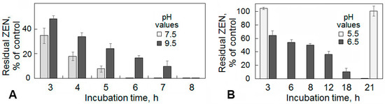 Histograms illustrating the time course of a zearalenone (ZEN) degradation in model solutions by the recombinant lactonohydrolase preparation occurred at non-optimal alkaline (A) and acidic pH (B) values as well as the irreversible inactivation of the enzyme at pH 5.5 (B). See explanations in Figure 4.