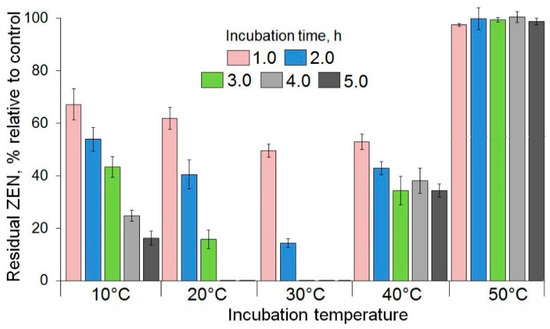 The effect of temperature on the degradation of zearalenone (ZEN) in model solutions after incubation at optimal pH 8.0 with the recombinant lactonohydrolase preparation (PR-ZHD **). Results are presented as the means of three experiments, each including three replications. Error bars indicate SD. ** For additional explanations see captions under Figure 4.