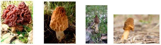 Pictures of some False and True morels. (A) The False morel Gyromitra esculenta which has a wrinkled, brain-like cap. Source: Wikimedia Commons (public domain). Photographer: Severine Meibner. (B) A true yellow morel, Morchella esculenta, which has a honeycomb cap attached at its basis to the stipe. Source: Wikimedia Commons (Public domain). Photographer: J.Marqua. (C) Morchella semilibera, a true black morel (=Mitrophora semilibera). Source: Wikimedia Commons (Public domain). Photographer: Abaddon1337. (D) The false morel Verpa bohemica, which has a wrinkled and subdimpled cap, put like a thimble over a finger and without any attachment at its basis to the stipe. Source: Wikimedia Commons (Public domain). Photographer Tatiana Bulyonkova. For species recognition, colour being variable, specific morphological traits is a basis for differentiation between Gyromitra sp. and Morchella sp. At the contrary, Verpa bohemica and Morchella semilibera, have similar traits.