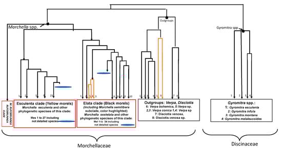 Presentation (schematic view) of a partial phylogenetic tree for positioning of some true and false morels (adapted from published data [,]; branches are respected but not the bootstrap values). Morchella species are classified morphologically into two main clades, black (Elata clade) and yellow (Esculenta clade), and the ascocarps within each species also differ in color nuances and shape []. Verpa species can show 99% similarity with Disciotis venosa and are members of the Morchellaceae family but are located in an outgroup [,]. Gyromitra species belong to another cluster, the Discinaceae family []. Mes for M. esculenta; Mel for M. elata [].