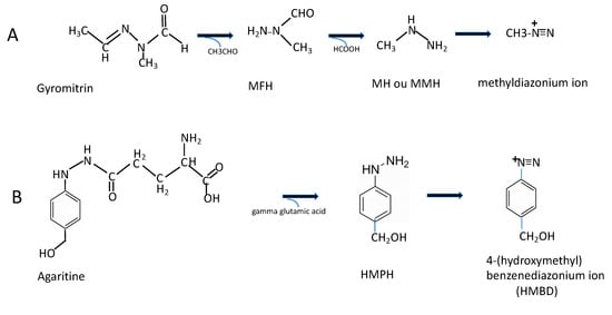 Schematic view of degradation of two hydrazinic toxins, Gyromitrin and Agaritine, into instablediazonium ions (from which reactive radicals are generated): (A) Gyromitrin: (acetaldehyde methylformylhydrazone)→N-methyl-N-formylhydrazine (MFH)→monomethylhydrazine (=MH or MMH). (B) Agaritine: (β-N-[γ-L-(+)- glutamyl]-4-hydroxymethylphenylhydrazine) →4-(hydroxymethyl)phenylhydrazine (HMPH)→ 4- (hydroxymethyl)benzenediazonium ion (HMBD).