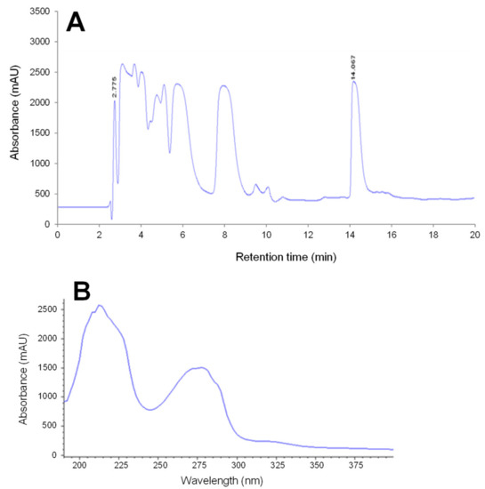 Chromatogram obtained after analysis of toxic water-soluble extract of contaminated mussels harvested from Bizerte lagoon during September 2006 and December 2019 (A) and absorbance spectrum of the Mussel Toxic Peptide (MTP), eluted at 14 min (B). (A) Analysis was carried out by reversed-phase HPLC using a C18 symmetry column (4.6 × 250 mm, 5 µm; Waters SAS, Guyancourt, France). Elution was done with a mobile phase composed of a gradient of solvent A (aqueous phase: Milli-Q water + 0.1% TFA), and solvent B (organic phase: acetonitrile + 0.1% TFA), whose proportions were controlled by a programmable pump system (Agilent 1100 series, Agilent Technologies, Santa Clara, CA, USA). (B) MTP has a UV-spectrum characteristic of proteins.