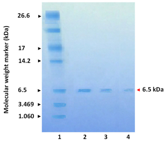 Characterization of the MTP using 16.5% SDS-PAGE Tris-tricine gel with Coomassie Brilliant Blue R-250 staining. (1) Protein molecular weight marker shown on the left. The protein markers used were from 1.060 to 26.6 kDa. (2, 3 and 4) 2, 1 and 0.5 µg of MTP were applied, respectively. The native molecular mass of MTP has been estimated to be 6.5 kDa, and the electrophoretic profile showed the homogeneity of this toxin (MTP migrated as a single band).