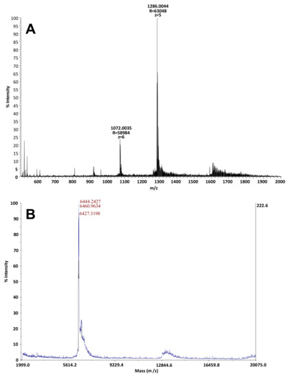 (A) MS spectra using the LTQ-Orbitrap mass spectrometer at high resolutions in nano ESI (range m/z 500–2000) of MTP eluted at 14 min with a molecular mass of 6430.022 Da. (B) MS spectra after MALDI-TOF analysis (range m/z 1999–20,000) of MTP eluted at 14 min with a molecular mass of 6427.3198 Da with the presence of oxidized species to the mass 6444.2427 Da and 6460.9634 Da.